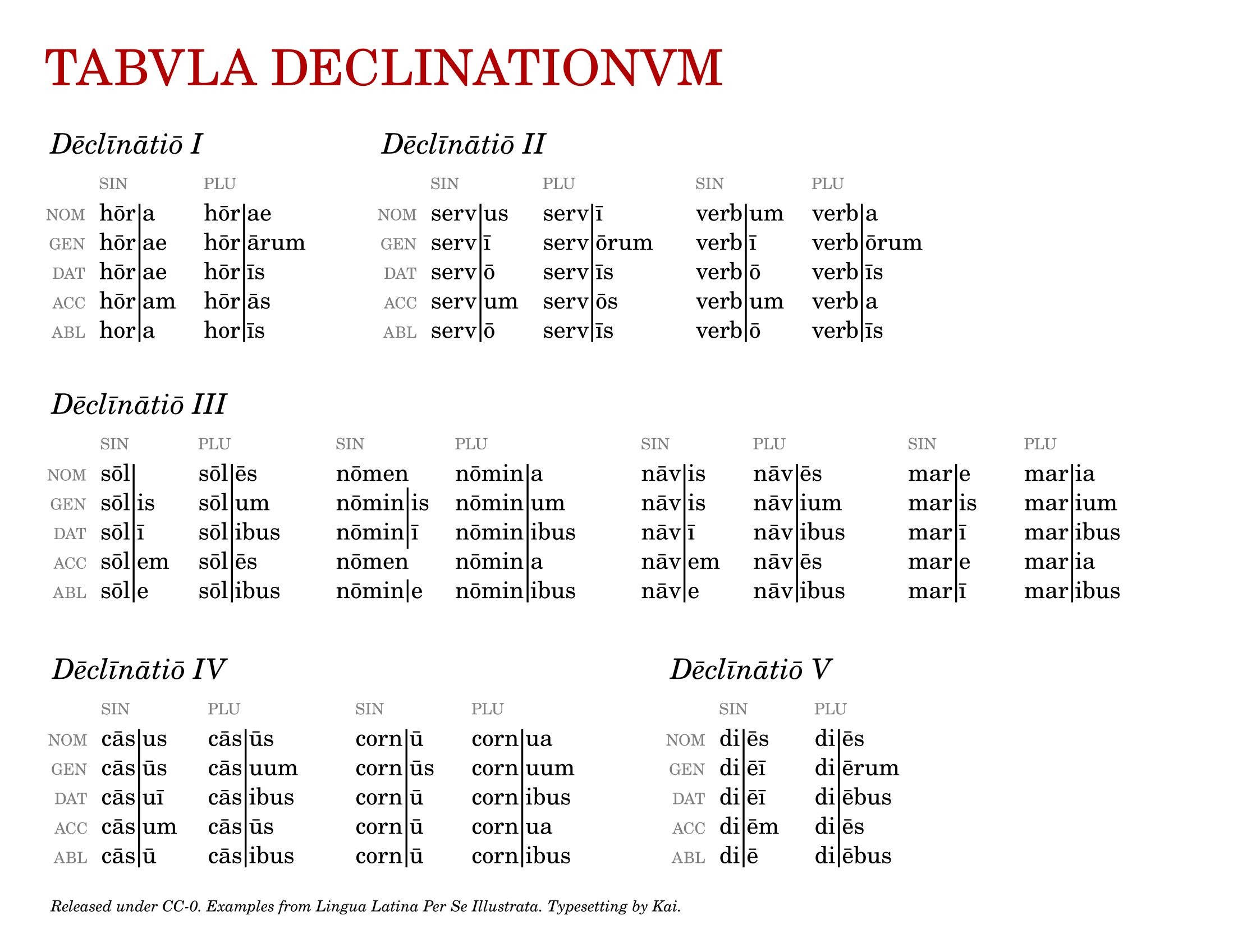As stated in the file: this is released under CC-0, and examples are picked from Lingua Latina Per Se Illustrata (though LLPSI in no way “owns” these words, it still gave me tremendous help by, uhh, listing everything out for me). Typesetting by me.