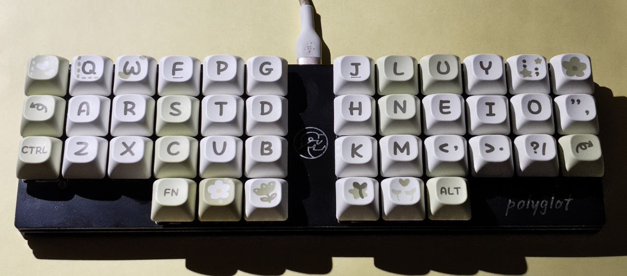 Anyway. I found my Stenokeyboards Polyglot today. It really is a fantastic keyboard, although I was bad at stenography and gave up before I got to a level where I can use steno to write an essay without going crazy. Without the custom keycaps, though, it is an orthogonal and small keyboard. I realized today that I have always wanted an orthogonal, small keyboard. I am also starting to use Colemak, so I decided to modify and flash a new firmware.