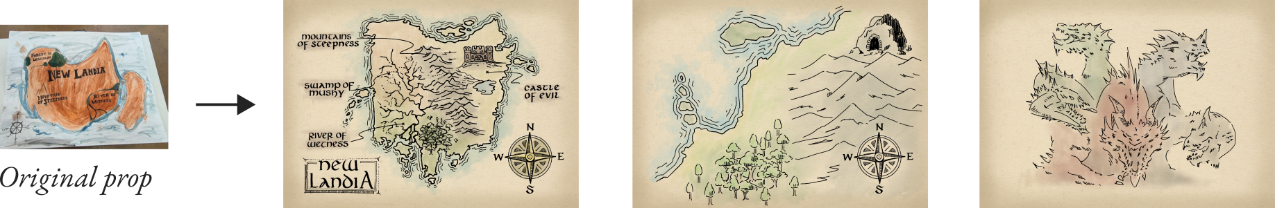 Some scenes required some hand-drawn “manuscripts”, for which I reused the background from the title typography. This included another sketch of Tiamat, which I tried to give a faithful rendition in reference to the 5th edition’s official art. There are two separate maps: a regional one used at the beginning of the show, and a large, detailed map of the entire “New Landia”. Since the show is set in Athens, Ohio, the prop team gave me the bright idea to make the shape resemble Ohio, like what was done for a separate map prop.